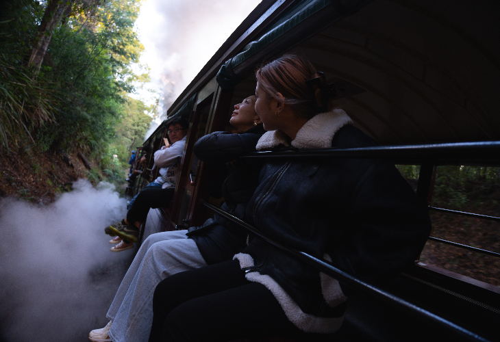 今も現役で走り続けるパッフィンビリー蒸気機関車に乗って、ノスタルジックな列車の旅を楽しみます。