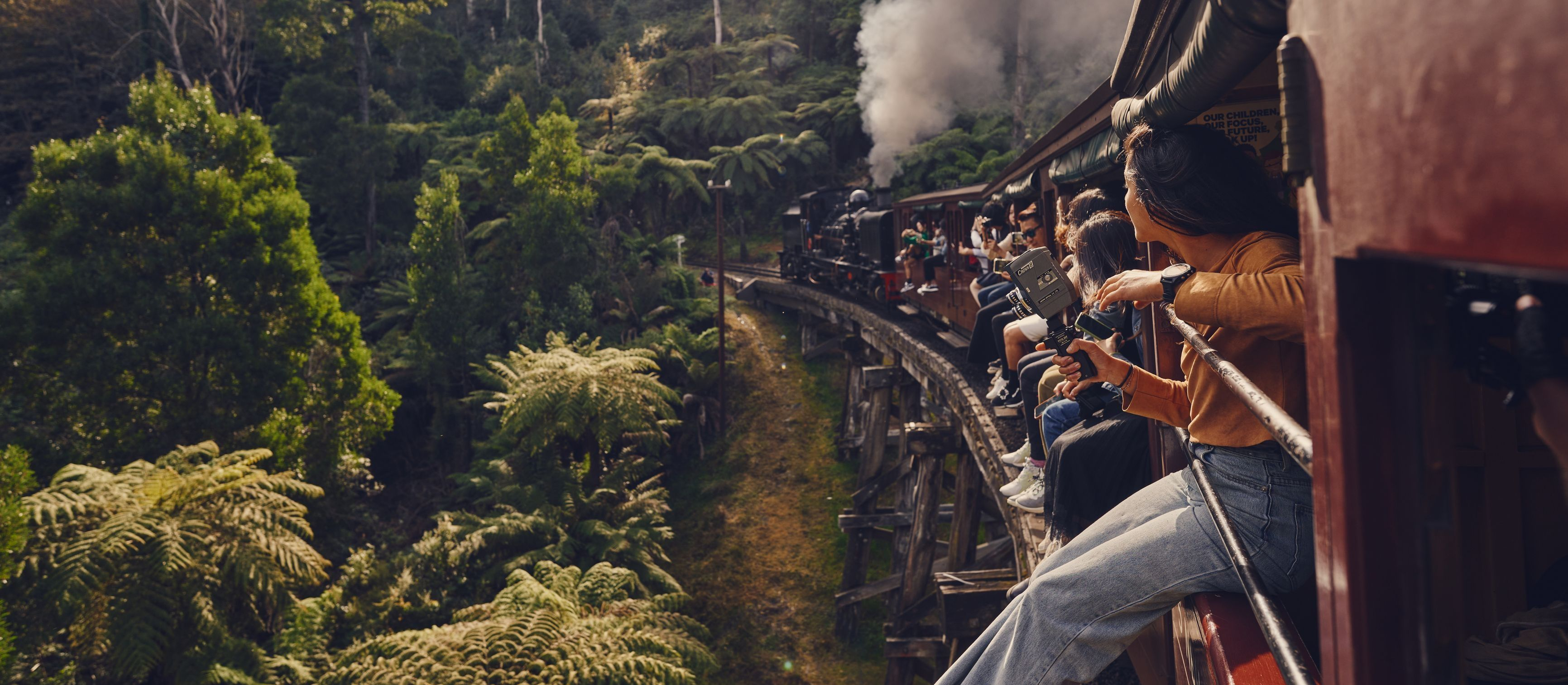 昔ながらのスタイルで窓枠に腰掛け、風を感じながら走る体験は、子どもから大人まで大人気。出発から数分で登場する象徴的なトレッスル橋もお見逃しなく!カメラの準備を忘れずに。