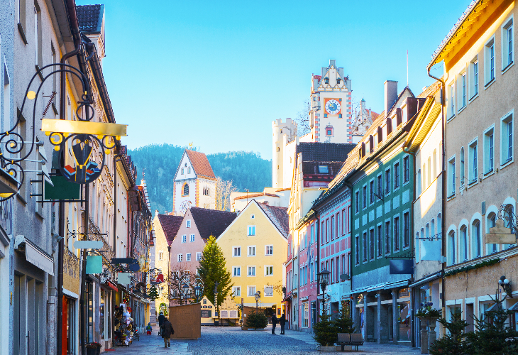 ロマンチック街道の終点であるフュッセンは、朱色の屋根とカラフルな壁面の建物が並ぶ明るい町です。ノイシュヴァンシュタイン城やホーエンシュヴァンガウ城への観光の基地として、多くの観光客で賑わっています。丘の上にはホーエス城があり、山々を背にして美しい姿を見せてくれています。