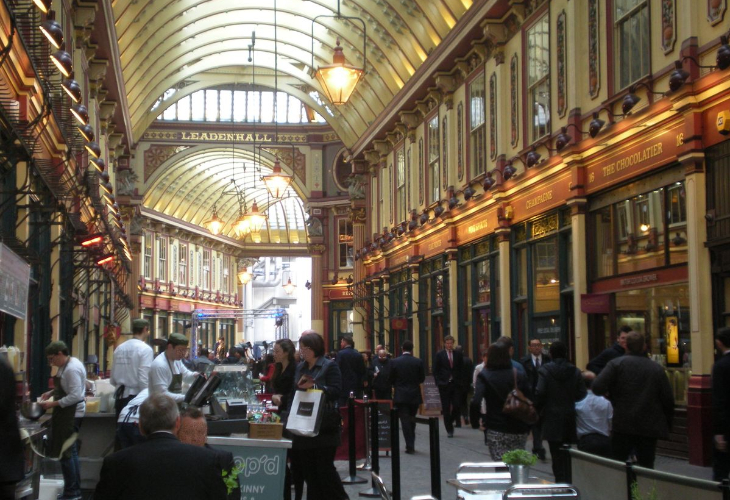 リーデンホール・マーケットでは、中世から続く肉市場の名残を見学。近代的な高層ビル群と歴史的建築が隣り合うロンドンならではの景観を楽しめます。