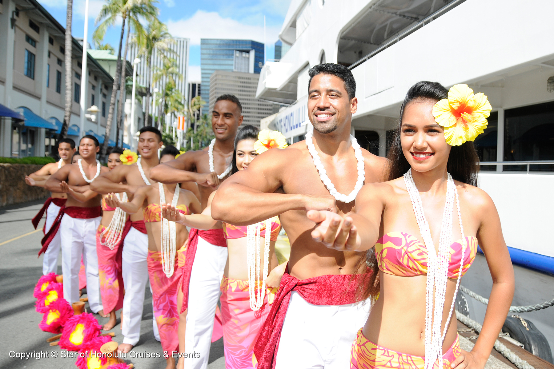 ピアサイド(埠頭)にて、生演奏のウエルカムフラをお楽しみいただき、スター・オブ・ホノルル号に乗船していただきます。