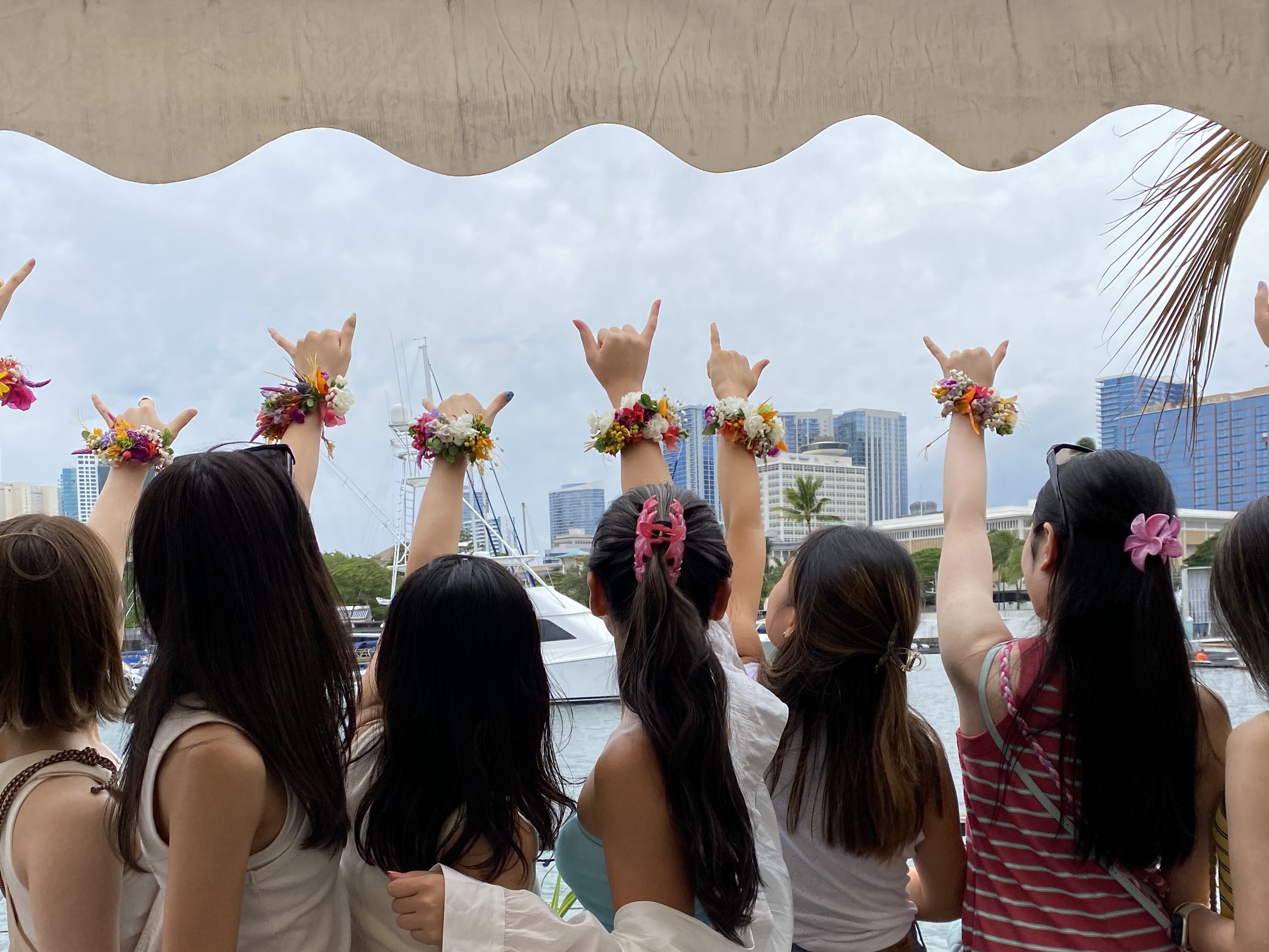 女子旅でおそろいのブレスレットを付けてハワイの景色と一緒に写真撮れば