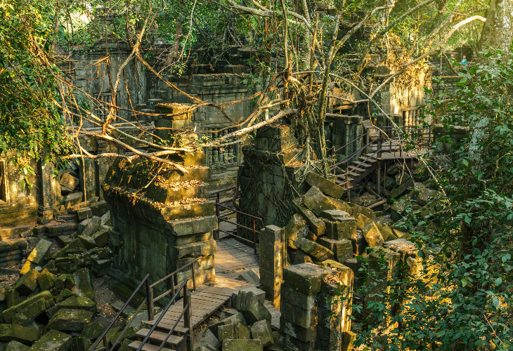ベンメリア遺跡は、他のアンコール遺跡群と異なり、ほとんど修復されていません。そのため、遺跡は崩れた状態のまま自然に呑み込まれ、木の根が建物に絡まり、神秘的な光景を作り出しています。まるで、自然と遺跡が共生しているかのような美しい景観が広がっています。