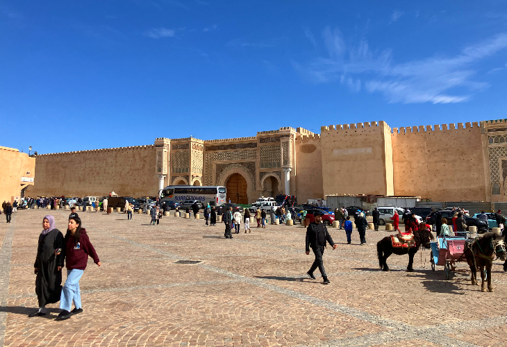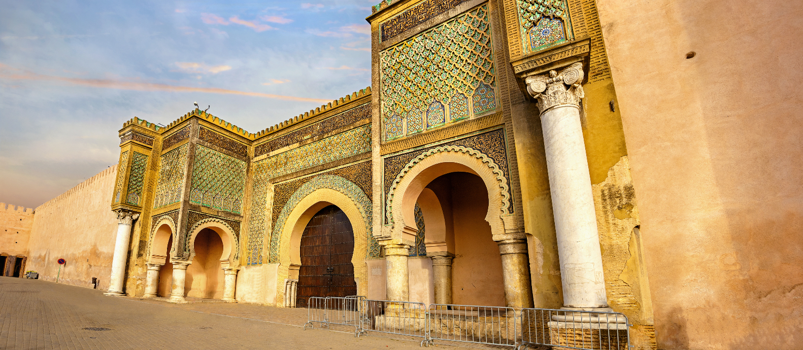 モロッコ最大級と称される壮麗な城門。ゼリージュ(タイル)や大理石を用いた精緻な装飾は圧巻で、メクネスの象徴的存在です。