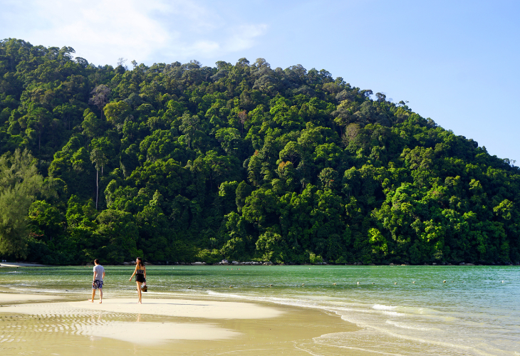 ペナン国立公園内に位置し、徒歩またはボートのみでアクセス可能。人の少ない静かなビーチで自然を独占。