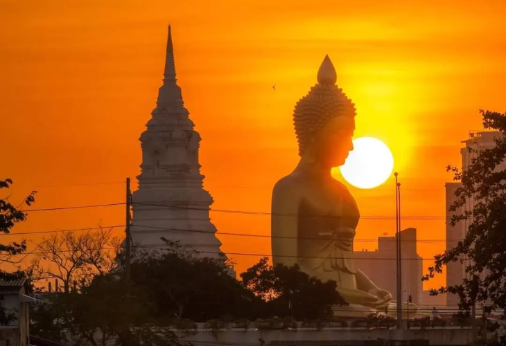 夕日の風景: 夕暮れ時には、寺院の金色の塔が夕日の光を受けて輝き、その幻想的な雰囲気は訪れる人々を魅了します。