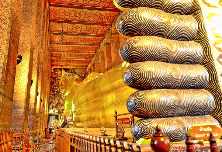 美しい壁画とモザイク: 寺院内には、美しいモザイクや金箔で装飾された壁画があります。特に、涅槃仏の足元には象徴的な模様が施されており、見る価値があります。