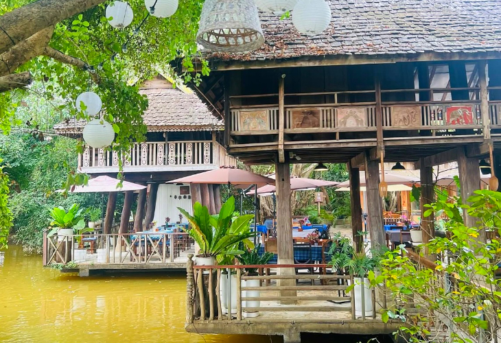 北タイ・チェンマイ州サンカムペーン郡サンクラン村に位置し、市内から車で約20分ほどの場所です。もとは稲の貯蔵倉だった木造建築を活用し、自然に囲まれた落ち着いた庭園空間として営まれています。ミシュランガイドの Bib Gourmand にも選ばれており、「手頃で美味しい料理」が高く評価されています。