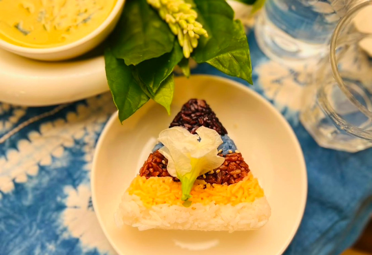 タイ北部の伝統的なジャスミンライスを、蝶豆花(バタフライピー)、ターメリック、パンダンリーフなど天然素材で色付けした「虹色ライス」が名物。見た目の美しさと健康的な味わいが魅力です。