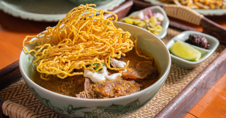 見た目も素敵なカオソイ(タイ風カレーラーメン)とタイの定番デザート・カオニャオマムワンをお楽しみいただけます。