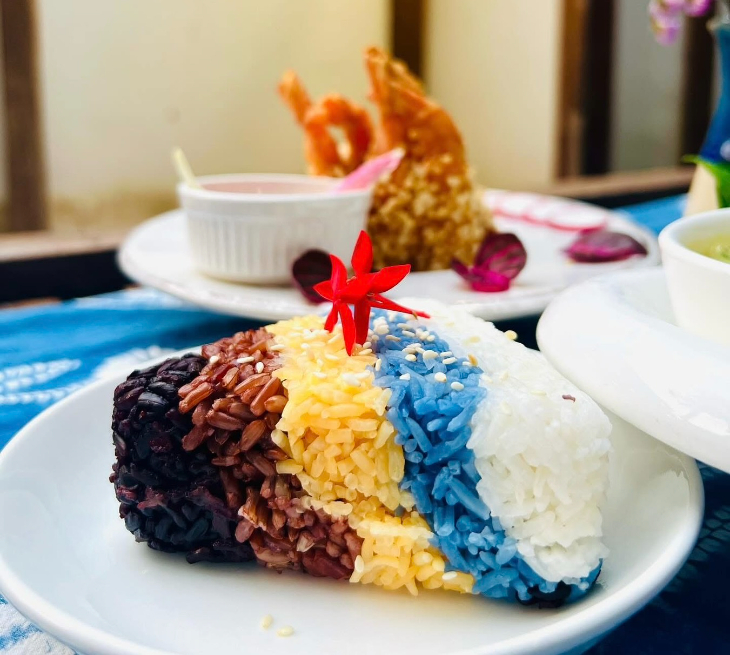 タイ北部の伝統的なジャスミンライスを、蝶豆花(バタフライピー)、ターメリック、パンダンリーフなど天然素材で色付けした「虹色ライス」が名物。見た目の美しさと健康的な味わいが魅力です。