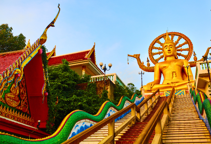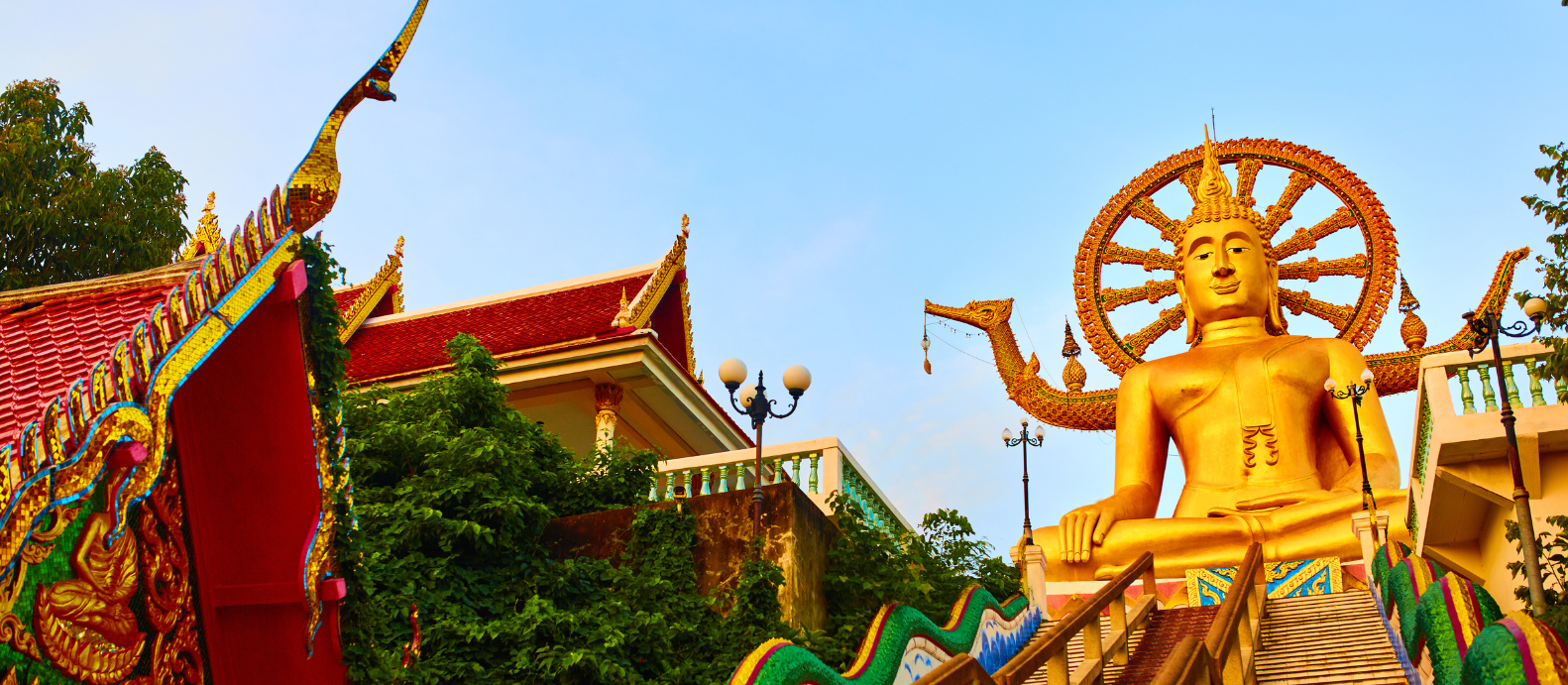 サムイ空港の北海岸にある高台にそびえたつ高さ12mある巨大な黄金の仏像「ビックブッダ」は、サムイ島のシンボルとして地元の人達からも親しまれています。また、釣鐘を鳴らしながら寺院から見下ろす海の景観が大変美しい事でも有名です。
