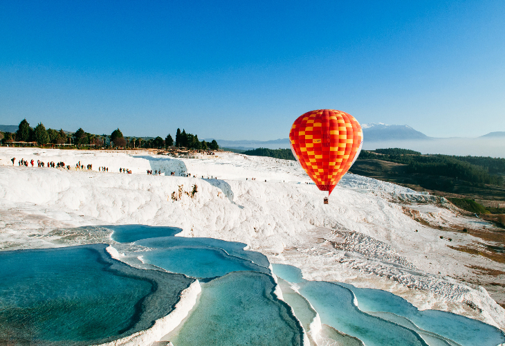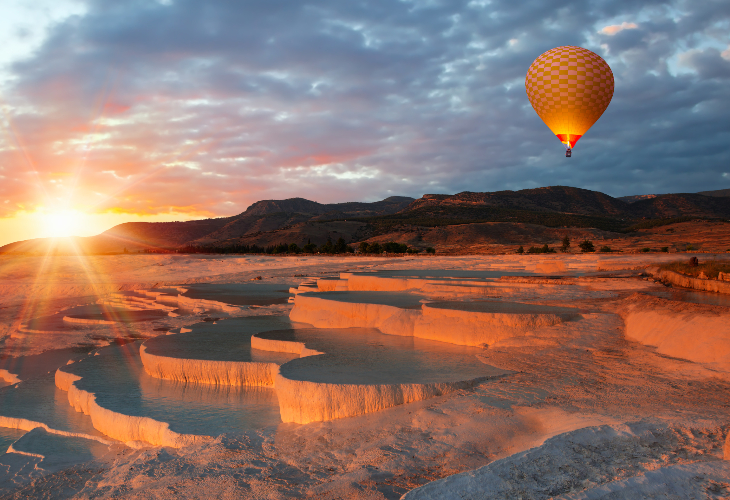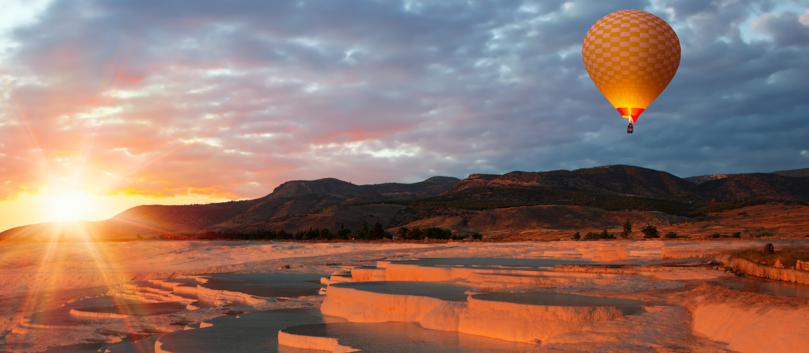 上空数千フィートからは360度の感動的な大パノラマが広がります。世界複合遺産の石灰棚や悠久の歴史を感じる紀元前の古代都市ヒエラポリス遺跡など美しい自然と文化の景観をご案内いたします。