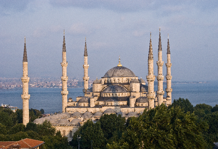 均整のとれた美しさでイスタンブールを象徴する建物。2万枚以上の青いイズニック・タイルを使用しており、ブルーモスクという名前で知られています。