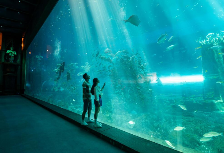 ・巨大なカメの形をした建築の中に300種以上の海洋生物を展示。海の世界を屋内でじっくり体験可能。