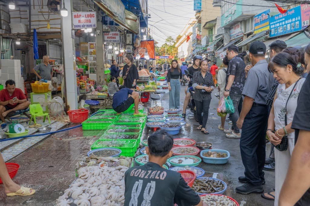 ブンタウの街の一角にあるシーフードマーケットを訪れます。漁師街ならでは、地元漁師が水揚げしたフレッシュなシーフードが道に並べられる姿はブンタウらしさ全開です!