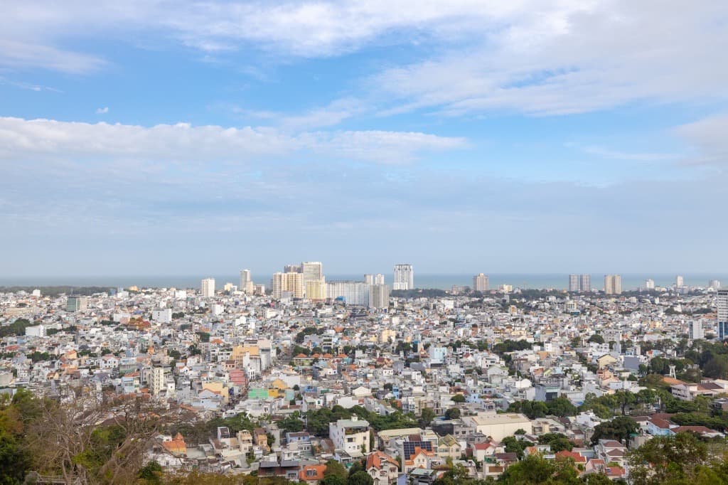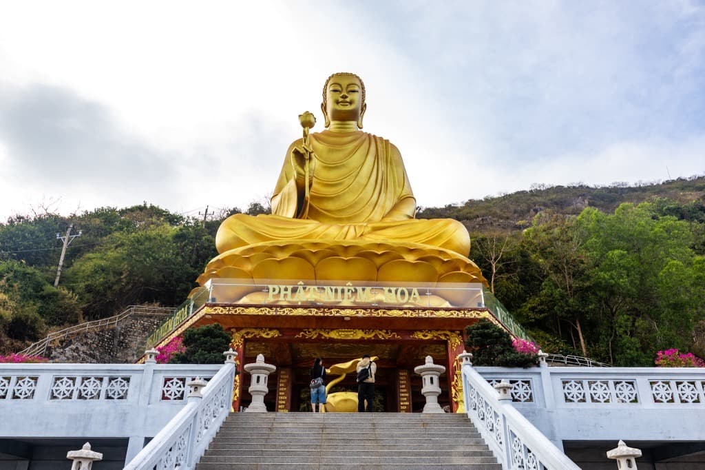 Chon Khong(チョンコン)寺院の山の中腹から街を見守る金の大仏様。美しい寺院とブンタウの眺めをお楽しみください。